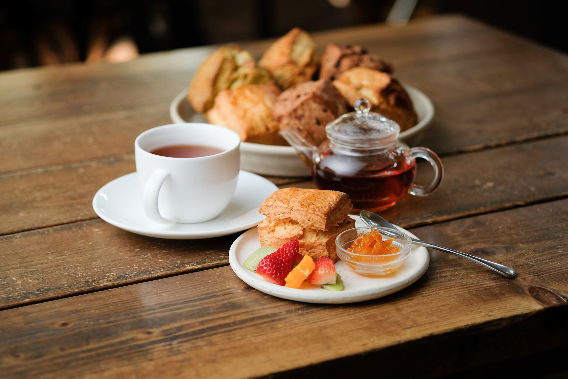 一番人気の発酵バター、菊川市特産の深蒸し茶とホワイトチョコレート、旬のフルーツのコンフィチュールなどたっぷり使用。